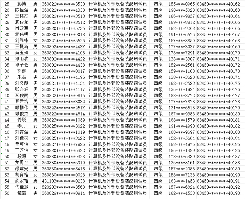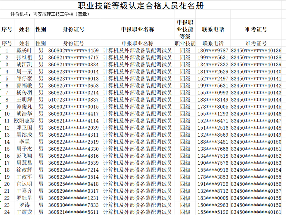 按照《赣人社规〔2022〕7号》文件精神。我校于2025年10月24日开展了计算机及外部设备装配调试员(计算机整机装配调试员)等级认定,共58人(四级),通过认定考核56人。现对认定考核合格人员进行公示。(名单附后)