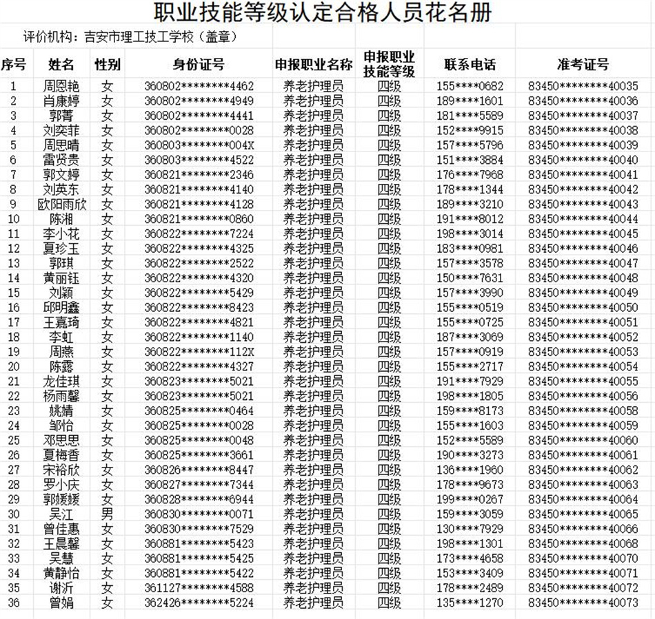 按照《赣人社规〔2022〕7号》文件精神。我校于2025年10月24日开展了养老护理员等级认定,共39人(四级),通过认定考核36人。现对认定考核合格人员进行公示。(名单附后)