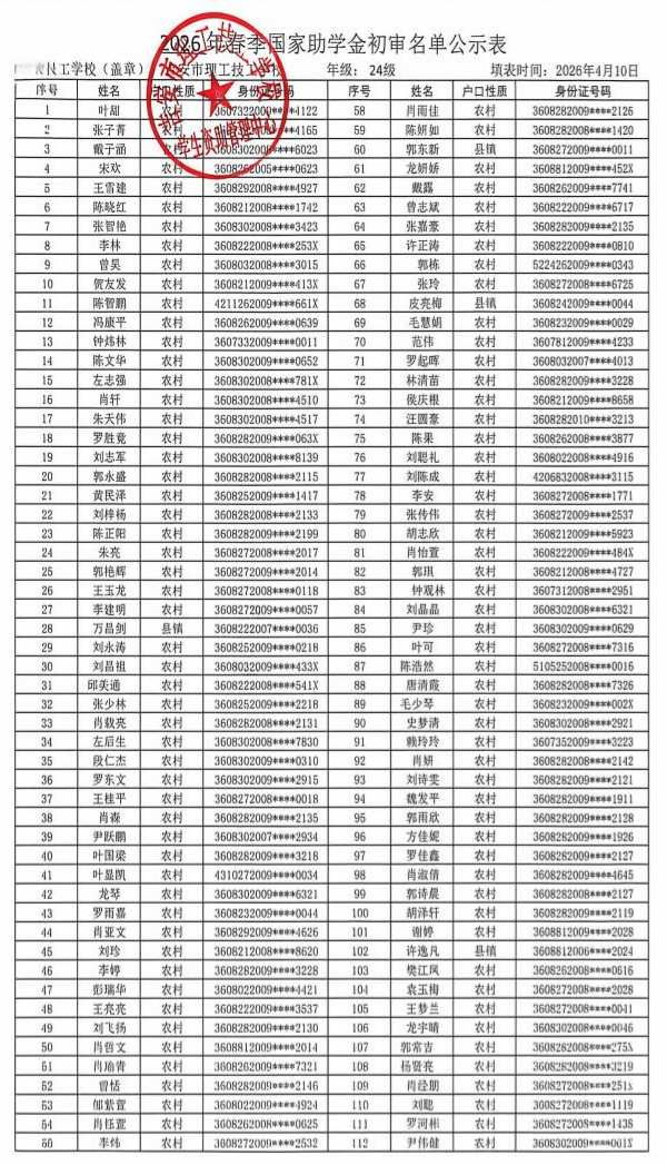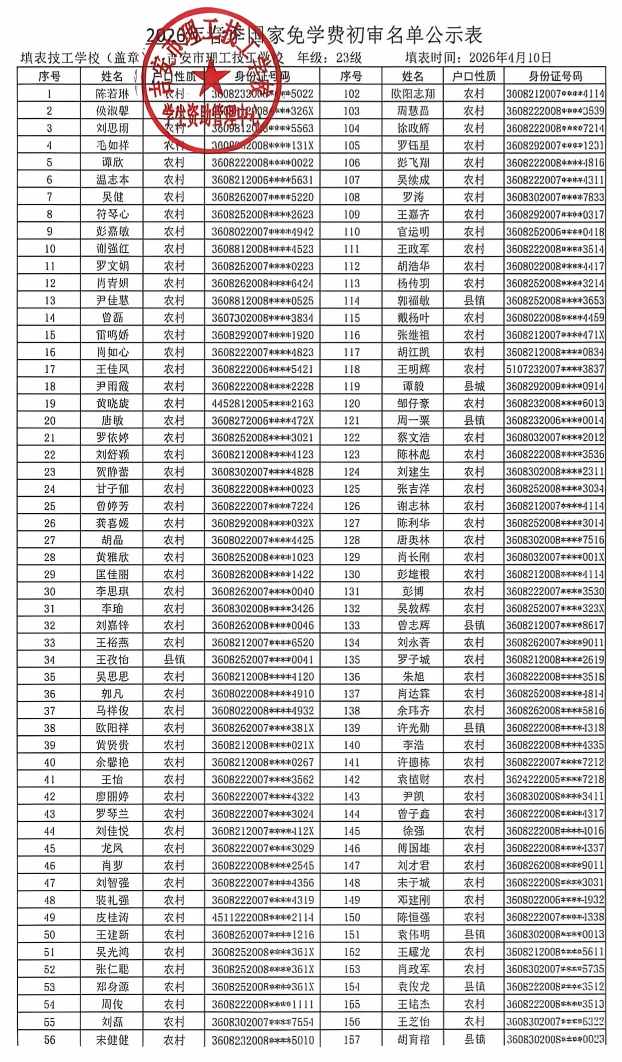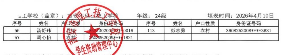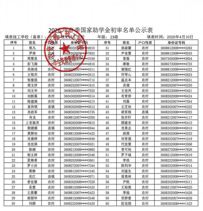 关于吉安市理工技工学校2026年春季学生资助名