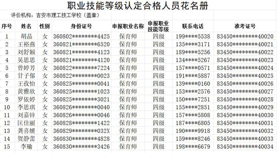 按照《赣人社规〔2022〕7号》文件精神。我校于2025年10月24日开展了保育师等级认定,共15人(四级),通过认定考核15人。现对认定考核合格人员进行公示。(名单附后)