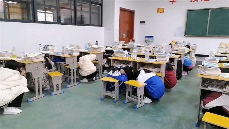 1、“地震警报”发出后,指导学生进行室内避震,学生迅速抱头,躲在各自的课桌旁,尽量蜷曲身体,降低身体重心,并尽可能用书包保护头部,最后一排靠里的同学面向墙,蹲在墙角处。
